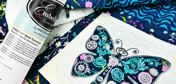 - If the design has more than 12,000 stitches in a 4” x 4” hoop then “float” a piece of non-fusible Embellish® Bold Tearaway under the hoop for added support.