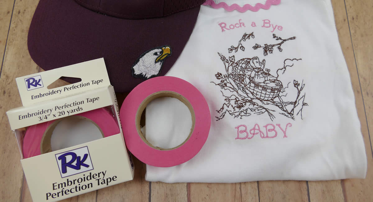 RNK’s Embroidery Perfection Tape lends a helping hand while stitching challenging items! Embroidering and embellishing small or tubular items such as a baby one-piece, a t-shirt, a sock, a hand-bag or similar pieces require us to really manipulate the item in order to get it in the hoop and under our needle successfully. RNK’s new Embroidery Perfection Tape is the absolute quickest and most simple solution to these challenges. The tape will hold back most fabrics without leaving a residue on the hoop, machine or fabric! Use for quilt in the hoop designs, holding stabilizer in place, keeping fabric or embellishment pieces from folding over and getting caught under the needle, etc. RNK’s Embroidery Perfection Tape is a must for all who embroider!