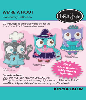CD Includes: 16 embroidery designs for the 4″ x 4″ and 5″ x 7″ embroidery hoops. This collection includes thirteen 4″ x 4″ filled owl designs plus three 5″ x 7″ appliqué owls which includes the appliqué cut files to use with your digital cutter. We have also included the original layered SVG artwork for creating your own clever and crafty works of art.