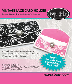CD Includes: in-the-hoop letter and credit card holders for the 9″ x 12″ and 6″ x 6″ embroidery hoops. Four designs fit size A2 cards and four designs fit most credit cards or business cards. This collection includes original SVG artwork files that can be used to design clever and crafty projects using your digital cutter.