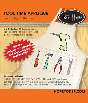 CD Includes: 10 tool machine embroidery appliqué designs for the 4” x 4” and 5” x 7” embroidery hoops. In addition to the appliqué cut files for the digital cutters, we have included the original SVG artwork so you can get cleaver and crafty with your digital cutter. Check our website for inspiration on using this collection with your digital cutter.