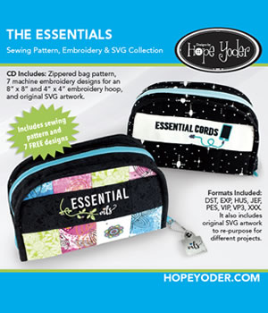 The Essentials Includes: Seven interchangeable embroidery designs (for 8” x 8” and 4” x 4” hoops) and a sewing patter to make the gusset zipper bag pattern with two variations; 2.5” patchwork or whole cloth versions. The bag has a zipper closure, and when opened, it lies flat for easy access. The inside of the bag is functional as it is pretty, featuring a water-resistant lining with two inside zipped pockets and two mesh pockets to keep your essentials from shifting. The original artwork SVG files are included to use with a digital cutter. Bonus; digital cutting zipper tags. Finished size 9” x 5.25” x 3” zipped and 12” x 9” opened.