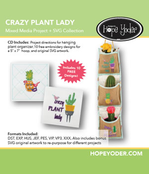 Crazy Plant Lady Project CD comes with complete directions for making this adorable plant hanger, plus 10 free machine embroidery designs for the 5″ x7″ hoop. The embroidery files are digitized for either 40 weight thread or 60 weight embroidery thread. In addition to the project and machine embroidery designs, you will receive the original SVG artwork to repurpose into other mixed media projects.
