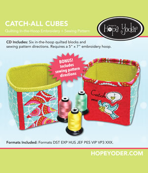 CD Includes: 6 in-the-hoop quilted blocks and sewing pattern directions. Make cute, colorful, versatile cubes to catch all your threads, craft supplies, scraps or whatever you can imagine. Finished cube is approximately 4 1/2 square. Requires a 5″ x 7″ embroidery hoop.