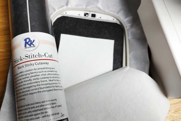 Stick-Stitch-Cut is RNK’s solution for embellishing and embroidering on challenging fabrics such as sweater knit, stretch velour/velvet, leather, pleather, vinyl, ultra-suede and more. Use this needle-friendly, sticky cutaway to secure hard-to-hoop items within the embroidery frame. Ideal for items or fabrics that could be damaged by the hooping process. This stabilizer offers the absolute correct foundation for fabrics such as leather and vinyl which require the elongated fibers found in this premium cutaway.