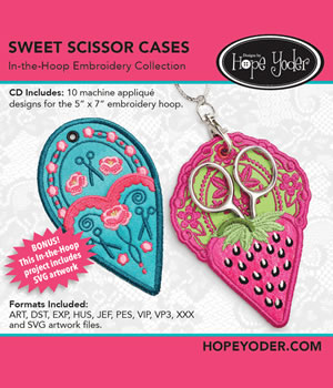 CD Includes: 10 machine appliqué designs for the 5” x 7” embroidery hoop. Perfect for holding your tiny scissors, keeping them close at hand. The collection includes original artwork SVG files that work in your digital cutter for endless projects!