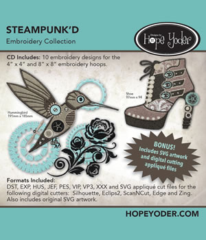 CD Includes: 10 steampunk machine embroidery designs for the 4” x 4” and 8” x 8” embroidery hoops. The butterfly, hat, and hummingbird designs are appliqués which include the appliqué fabric cut files to use with your digital cutter. This collection includes the original SVG artwork so you can get cleaver and crafty with your digital cutter.