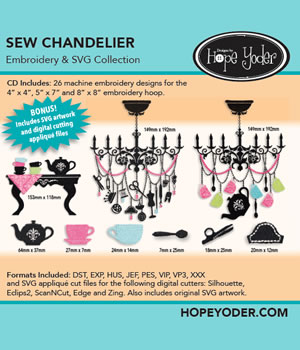 CD Includes: 26 machine embroidery designs with a tea party sewing theme. Mix and match the chains with the chandelier top. The sewing notions are small enough to fit on a covered button shell or use them to embellish your own fonts or tea towel quotes. Own an electronic die cutting machine? We have included the SVG artwork files to create cards, heat transfers, rhinestone templates and more.