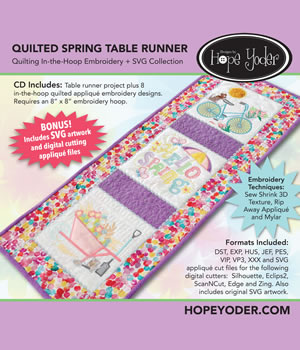 CD Includes: Spring Table Runner Project with detailed directions and photos. Join each block using two simple steps on a sewing machine. Mix and match blocks to make endless designs. Optional in-the-hoop techniques include: Sew Shrink 3D Texture, Rip Away Appliqué and Mylar. Each design has been digitized twice, once for 60-weight thread and again for 40-weight thread.