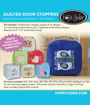 Quilted door stopper project with detailed directions and photos. Mix, match and embroider the blocks finishing the project on your sewing machine. Get clever and crafty with original SVG artwork using a digital cutter. All designs fit inside an 8″ x 8″ hoop.