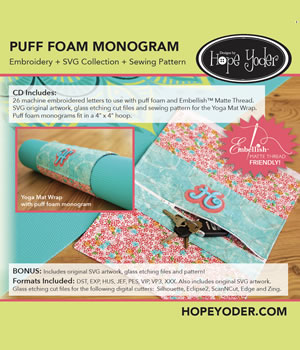 CD Includes: 26 machine embroidered letters to use with puff foam and Embellish Matte Thread. SVG original artowrk, glass etching cut files and sewing pattern for Yoga Matt Wrap. Puff Foam monograms fit in 4″ x 4″ hoop.