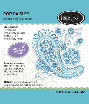 CD Includes: 13 machine embroidery designs for the 5″ x 7″ embroidery hoop. Each Pop Paisley design includes multiple color stops to color your world anyway you like or use one color thread as shown below. Check our website for fun tutorials using the Pop Paisley embroidery designs and SVG files.