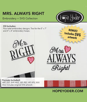 Collection includes four beautifully digitized embroidery designs. Mrs. Always Right and Mr. Right designs come in two convenient sizes for the 5″x7″ and 4″x4″ embroidery hoops. Embroider on bath towels, spa wraps, luggage tags, hats, visors, pajamas, slippers, T-shirts, robes, placemats, napkins or on a ring bearer pillow. This collection is great for bridal showers, wedding gifts, anniversaries and don’t forget about Valentine’s Day