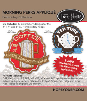 CD Includes: Retro coffee and tea machine embroidery designs for the 4” x 4” and 5” x 7” embroidery hoops. The designs are perfect to use with mug rugs. Ten of the designs are appliqués which include the appliqué fabric cut files to use with your digital cutter. This collection includes the original SVG artwork so you can get cleaver and crafty with your digital cutter.
