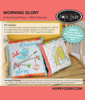 CD Includes: 27 embroidery files for creating an in-the-hoop zippered back monogram pillow that fits inside of an 8″ x 8″ hoop. Also includes a bird in-the-hoop zippered pillow that fits a 9.25″ x 9.25″ hoop. Designs are digitized for 60 and 40 weight embroidery threads.