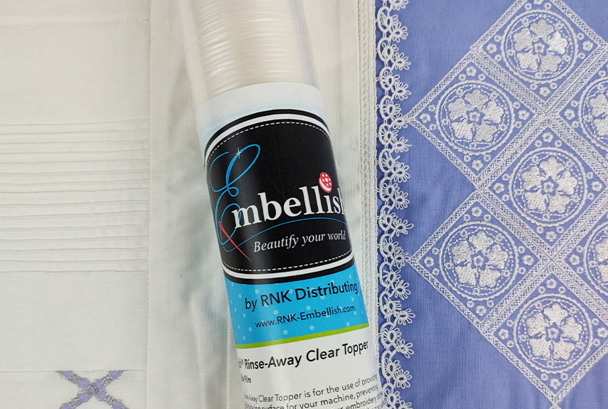 Embellish® Rinse-Away Clear Topper is used on top of the item within the embroidery hoop, providing a smooth embroidering surface for your machine. It keeps the embroidery thread elevated, preventing the thread from sinking into the fabric fiber. It acts as a “spacer” on top of the fabric, so the thread remains raised on top of the material. Embellish® Rinse-Away Clear Topper washes away clean. Use this product to prevent the fabric fibers from crushing when used on top of the fabric before hooping. Ever have your embroidery foot get caught between two layers of fabric, while embroidering in-the-hoop projects? Toppers are the solution. Use RNK® Embroidery Perfect Tape® to secure a piece of topper over the entire stitching area before starting the color change to seal the gap between the two overlapping fabrics. Once the packaging is opened, store Embellish® Rinse-Away Clear Topper in a sealed air-tight bag or container. We also have an iron-away topper when you need the topper to stay underneath the thread through, repeated wash and dry cycles, or for items that cannot withstand moisture.