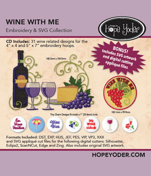 CD Includes: 16 machine embroidery designs reminiscent of wine country! This collection includes three applique designs and one free-standing wine bottle tag perfect for gift giving. Own an electric die cutting machine? Use the SVG files to create cards, heat transfers, tags and more.