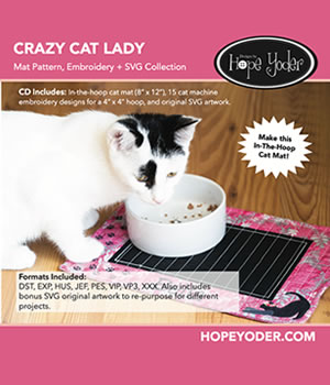 CD includes: In-the-hoop cat mat project (8” x 12”), 15 cat machine embroidery designs for a 4” x 4” hoop, and original SVG artwork.
