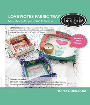 Make these cute fabric trays. Each project is designed to create an 8″ x 8″ or 4″ x 4″ tray. The collection includes the pattern for making the adorable trays, and it also contains seven machine embroidery designs in two different sizes. The trays have a solid base and are perfect for holding jewelry, loose change, candy, or all your sewing and crafting essentials. The designs include fun techniques such as mylar, puff foam, and raw edge applique. The applique designs are so cute you can use them for any project you can imagine, such as making throw pillows for your bed, make a quilt or embroider and put in a wooden hoop for wall art.