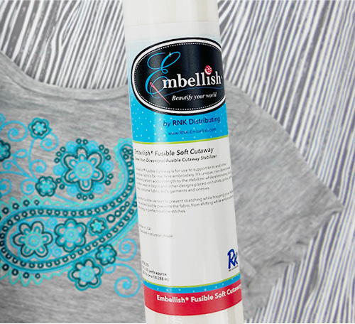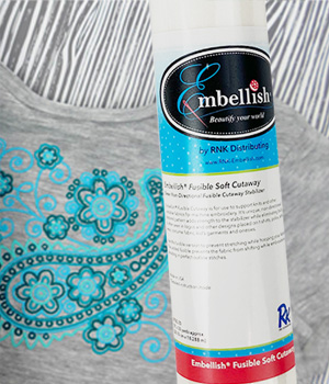 Embellish® Fusible Soft Cutaway is a premium, fusible, soft cutaway stabilizer. It is a green product made from 70% recycled fibers and is used with all machine embroidery designs on non-stable fabrics such as: athletic wear, costumes, flannel, knits, T-Shirts, onesies, rain jackets, polos, pashmina’s, wool, and wool blend acrylic scarfs. Embellish® Fusible Soft Cutaway is sheer and directional, created with a unique embossed pattern for added support. The added temporary fusible prevents the fabric from shifting while hooping and embroidering, resulting in perfect outline stitches. Because of the sheerness of this cutaway, it will not shadow through the fabric or garment. Premium nylon fibers are superior to polyester because nylon is super-structured and resists stretching where polyester stretches. It is also available in a nonfusible version.